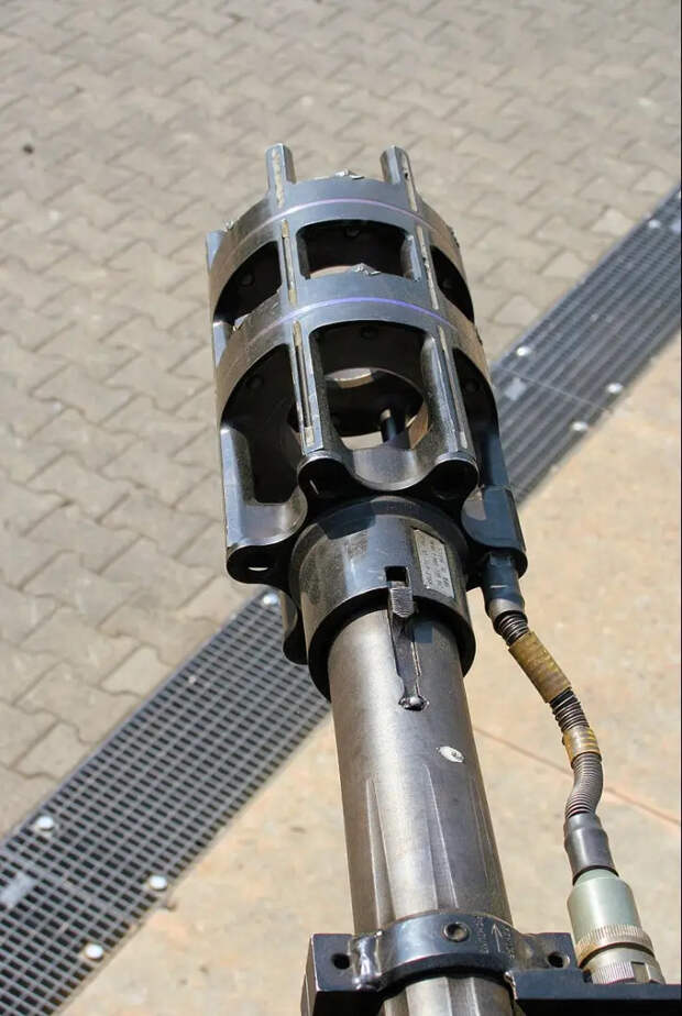 Дульный срез ствола левого орудия «Гепарда» с устройством измерения начальной скорости снаряда (v₀ Messanlage), которое играет ключевую роль при применении AHEAD/programmable airburst боеприпасов. Оно также используется при тестах и калибровке орудий, баллистических расчётах, стрельбе по движущимся целям и проверке работы пушек после ремонта или модернизации