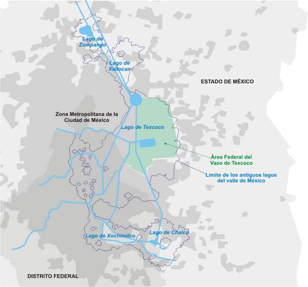 Остатки озера можно рассмотреть вот в этих водоемах на востоке Мехико. Причем, в гугл-картах можно так же рассмотреть каналы, идущие через город: