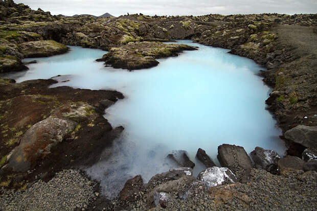 Вода, стекающая с холма, насыщена карбонатами и тоже окрашена в белый цвет. Соли откладываются в минеральный налет.