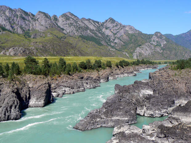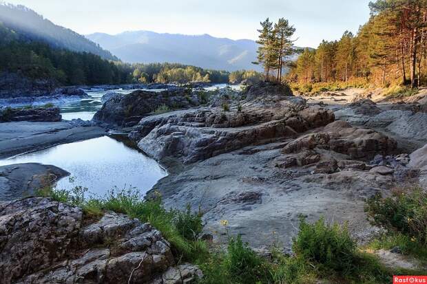 А что может означать «кисельные берега»? Мое мнение, что «молочные реки» - это остаточный процесс от тех масштабных катастрофических процессов выхода воды с растворенными в ней породами и минералами. В самом начале события выходили грязевые массы с камнями, которые отложились в пойме рек в виде глиняных осадков, галечника. И там был кисель из глинистых отложений. Которые относительно быстро каменели. Их успевала частично размывать вода реки, образуя причудливые каменные пейзажи. Пример берегов р.Катунь: