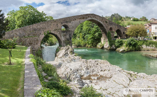 Мост Кангас-де-Онис в Испании. Так же видны каменные массы в русле реки. И они отложились после опоры моста, где сила течения не смогла их смыть и они окаменели. Хотя, не исключено, что это лишь визуальное совпадение.