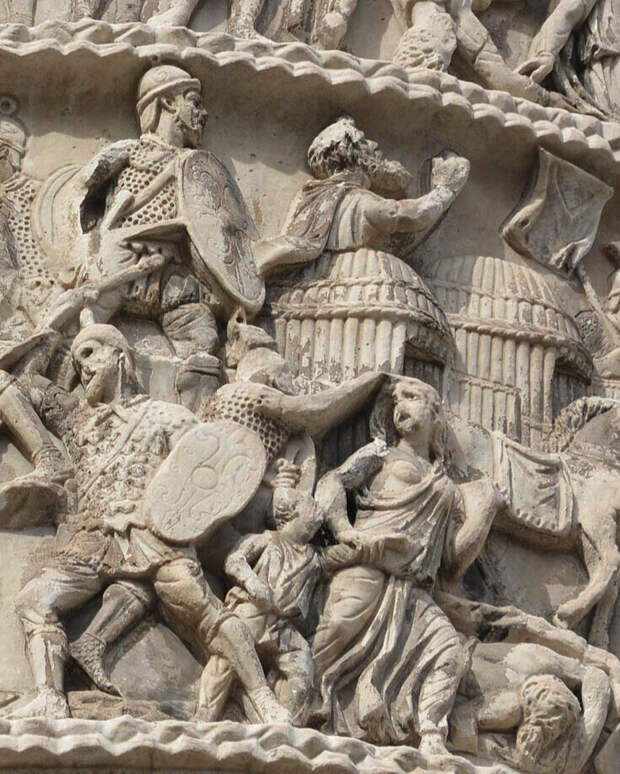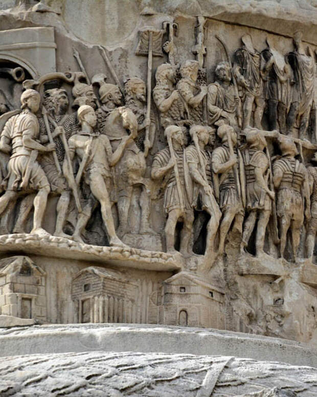 Колонна Марка Аврелия. Расположена в Риме. Воздвигнута между 176 и 192 годами в память о Маркоманской войне. Общая высота колонны - 42 м. Но три метра основания находятся под землёй (как и большинство строений в Риме). Колонна состоит из 28 мраморных блоков диаметром 3,7 м. Видны стяжки, которые скрепляют блоки. Колонна полая. Внутри есть винтовая лестница, состоящая из 200 ступеней. Для ее освещения в блоках сделаны прорези, узкие окна. На колонне с 16 века установлена статуя апостола Павла, а изначально стояла статуя Марка Аврелия.