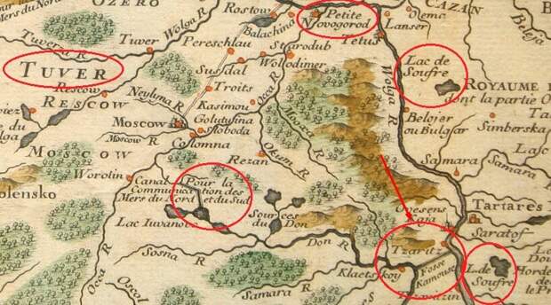 На этом фрагменте карты обозначен не только еще не существующий Волго-Донской канал, но и другие каналы. Возможно, по рекам можно было попасть из Балтийского моря в Каспий (через Волхов в Волгу). А из Дона в Оку. Другое объяснение - на карте обозначены волоки. Когда небольшие суда бурлаки перетаскивали из одной реки в другую. Или грузы разгружали и на телегах перевозили к другому судну.