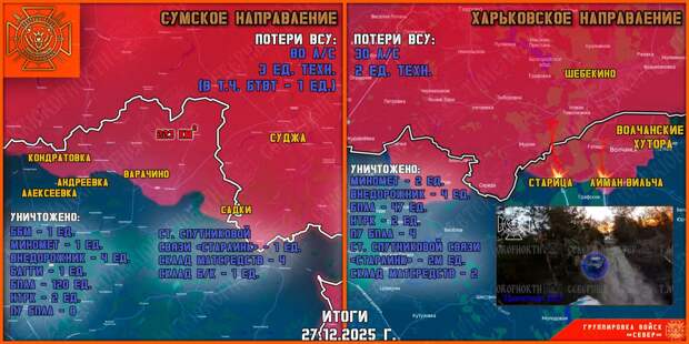 На Сумском направлении штурмовые подразделения группировки войск «Север» продолжают продвижение вглубь Сумской области на нескольких участках фронта. Российская авиация и расчёты ударных БПЛА точечно отработали по выявленным целям на участках продвижения. Противник перегруппировывается и оказывает ожесточённое сопротивление в обороне. В районе населённого пункта Низы Сумской области российскими ударными дронами уничтожено крупное хранилище ГСМ для нужд ВСУ. Возгорание не могли потушить в течение нескольких часов. Штурмовые группы продвинулись на восьми участках фронта в Сумском и на трёх в Краснопольском районах Сумской области. За сутки общее продвижение составило до 750 м.