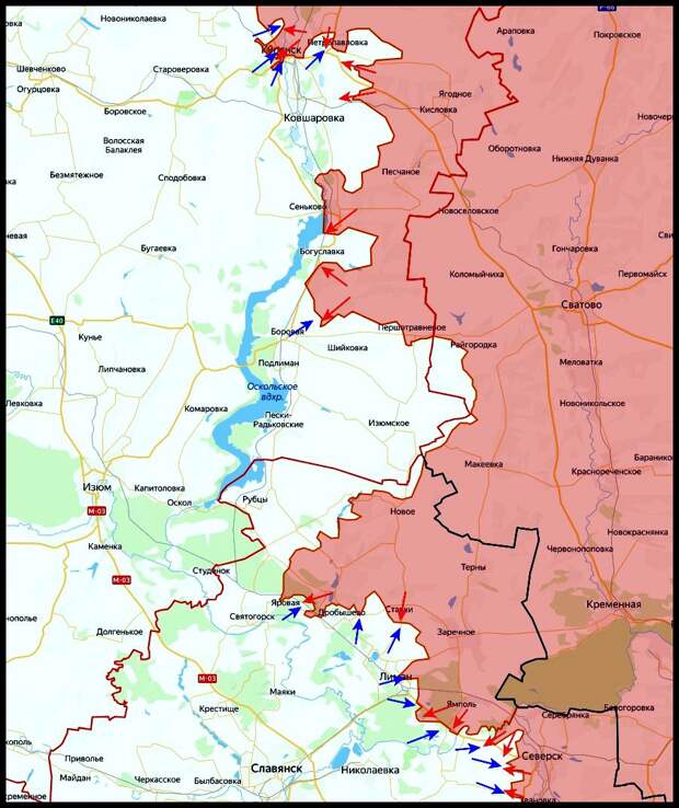 Продолжается штурм и зачистка Озёрного с расширением зоны контроля. ВС РФ закрепились на восточных окраинах и продвигаются в северо-западной части населённого пункта. Достигнуто продвижение северо-западнее Дибровы, взяты опорные пункты. Карман между Ямполем и левым берегом Северского Донца последовательно сжимается. Спецназ наносит удары по переправам и логистике противника у Маяков и Голубых Озёр, уничтожая технику. Предприняты попытки форсирования реки севернее Закотного.