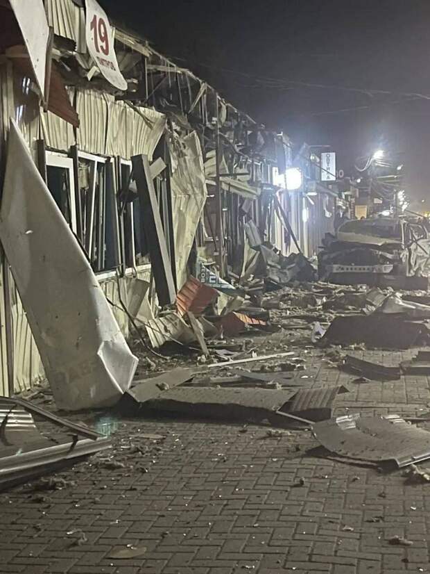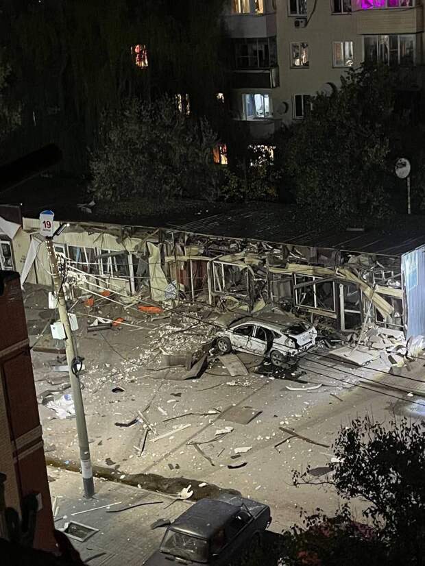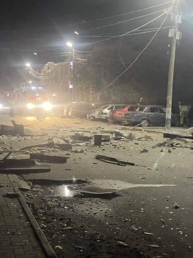 Обломки беспилотника упали во двор многоквартирных домов по улице Октябрьской – повреждены стёкла окон, автомобили, торговые павильоны и здание частного медицинского центра. По информации властей, обошлось без жертв и пострадавших. На улице Октябрьской сапёры обследуют территорию.