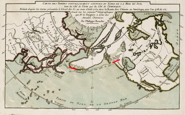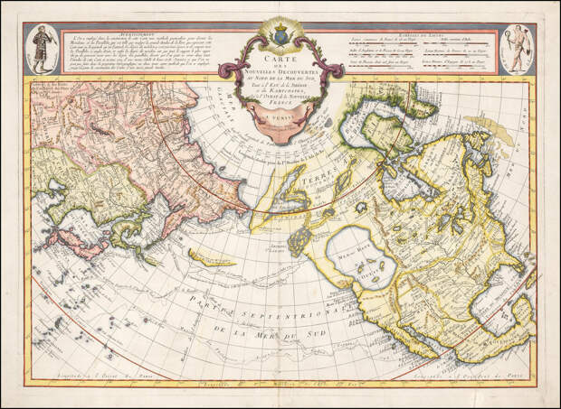 Эта карта на 10 лет старше, чем вариант выше и еще не такая подробная. Здесь так же показана странной формы Аляска. Но указаны русские территории на 1741г. Я предположу, что Аляска в то время еще находилась подо льдом. Он активно таял и большие реки (потоки воды) были обозначены, но ни горы, ни другие подробности еще не были известны. Как раз таящие ледники могли наполнять это Западное море. Или его питали выходы подземных вод, причем соленых. Т.к. таящие ледники сделали бы пресный водоем.