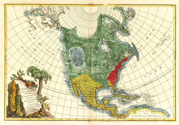 Карта 1762 года. Здесь уже изображены Великие озера и Гудзонов залив. А рядом с западным побережьем огромный водоем, соединяющийся с Тихими океаном с надписью: Mer ou Baye De l'Ouest – Западное море (или залив) (с франц узкого). Более подробная карта: