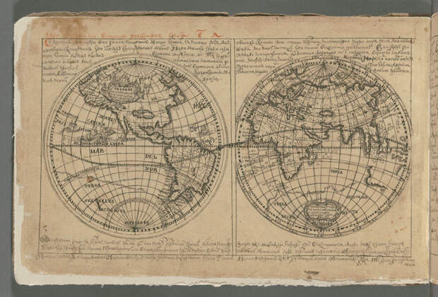 Если увеличить, то можно увидеть посередине Северной Америки море с надписью: MAYE SER+УМЪ. Может быть это так показаны Великие озера:
