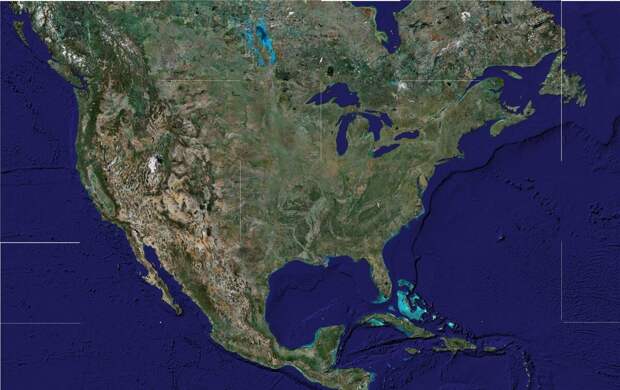 Аляска здесь изображена без изображения горных цепей, состоящая из непонятных заливов и совсем другой, чем на современных картах. Хотя восточное побережье показано в современном виде. Вряд ли картографы могли ошибиться с площадью внутреннего моря, изобразив его почти на 1/8 площади материка. На месте этого моря должны быть горы Кордильеры. А что на самом деле там сейчас – видим ниже.