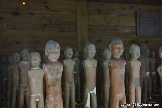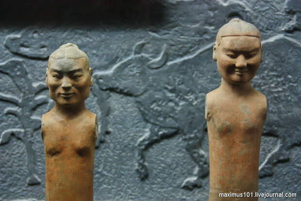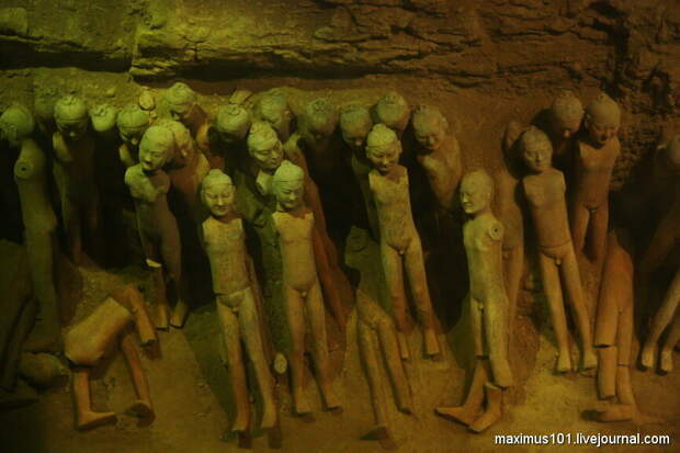 Археологи их выкапывают, очищают от глины. Изображены на них лица взрослых мужчин. Но почему был выбран уменьшенный масштаб при изготовлении скульптур-манекенов? И тела как у детей. Есть манекены на конях.