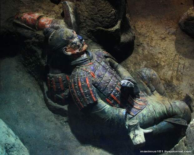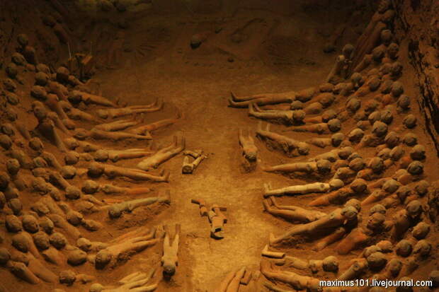 Оцените глубину, на которой находятся скульптуры. И задумайтесь о технологии погребения скульптур. По всей логике процесса: сначала необходимо выкопать большой площади и глубины котлован, уложить плитку, выставить скульптуры и все это качественно засыпать обратно. Вероятно после похорон императора засыпать нужно было быстро.