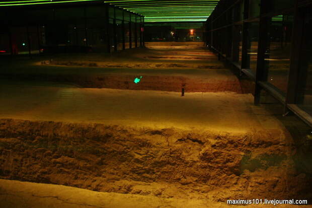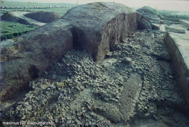 Фотографии из музея. Это раскопки кирпичной стены комплекса, производимой ранее. Стеной была обнесена вся территория. Виден брак или бой от скульптур, разбросанный у стены. Но все эти осколки находятся под толстым слоем грунта. Да, и сама стена, получается, уходит глубоко вглубь земли.