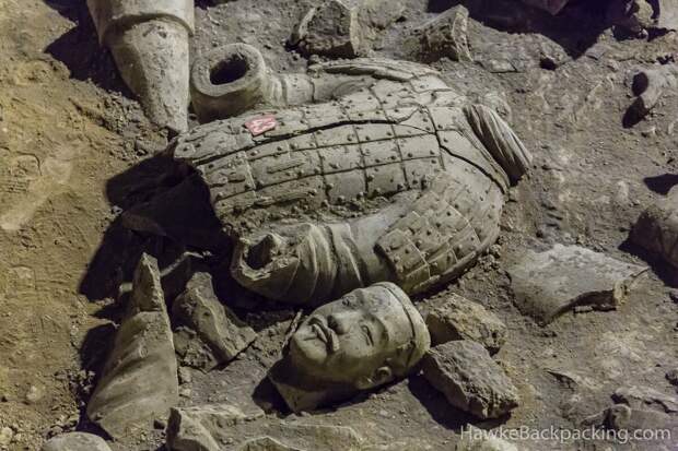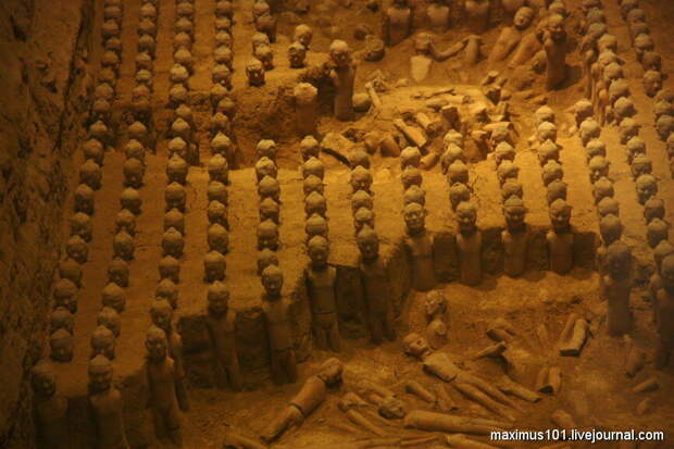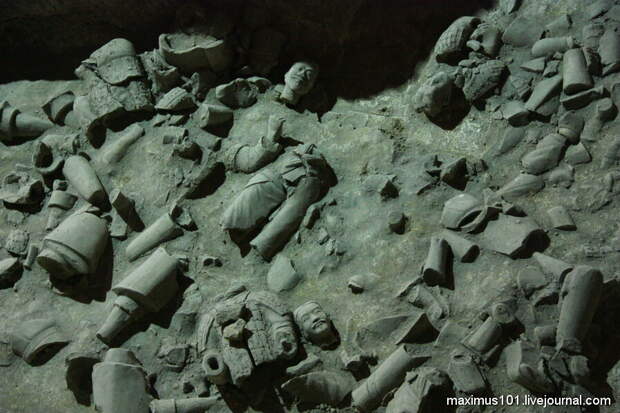 Скульптуры повалены, раздавлены, разбиты. Можно предположить, что это сделали расхитители гробниц в отдаленные времена. Но не могли же они перепахать эти гектары площадей с терракотовой армией? Тем более, на глубине в десять и более метров! Я считаю, что объяснение такое: т.к. скульптуры полые, и те которые упали – их раздавили массы грунта.
