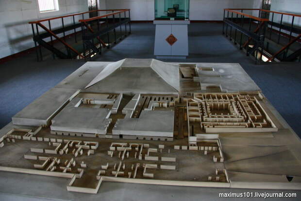 Были проведены масштабные раскопки и построен музей. На макете выше показано, какую площадь занимает здание музея у пирамиды. В траншеях были найдены тысячи скульптур, но не воинов, а типа манекенов, ростом ниже человеческого. Сейчас бы сказали, что это манекены для детской одежды. Скульптуры все одинаковые, с мужскими признаками. Но есть и женские. Все они почему-то без рук. Хотя отверстия для креплений есть.