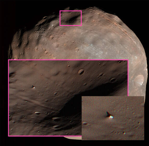 Еще один феномен. После получения снимков Фобоса в хорошем качестве, на нем в северной части, внутри кратера был обнаружен странный выступ, монолит: