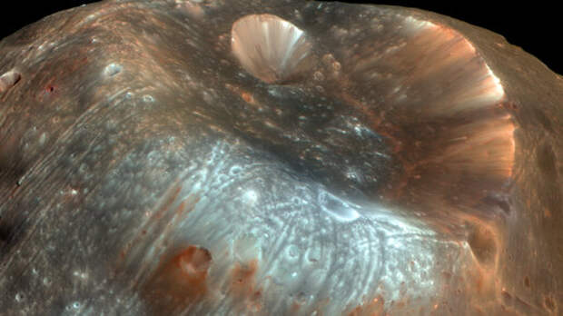И как видно по снимкам от Mars Reconnaissance Orbiter – Фобос имеет коричневый грунт (как и Луна и астероиды). От этого кратера расходятся борозды, имеющие длину многие километры. Их ширина 100-200 м и глубина до 20 м. Вероятно, они образовались при столкновении Фобоса с другим космическим телом. А обломки породы прорезали эти борозды на его поверхности, улетая по инерции от места столкновения. Но. Как это может быть, если этот кратер смотрит в сторону поверхности Марса, а до нее всего 6000 км? Со стороны Марса ничего не может прилететь априори.