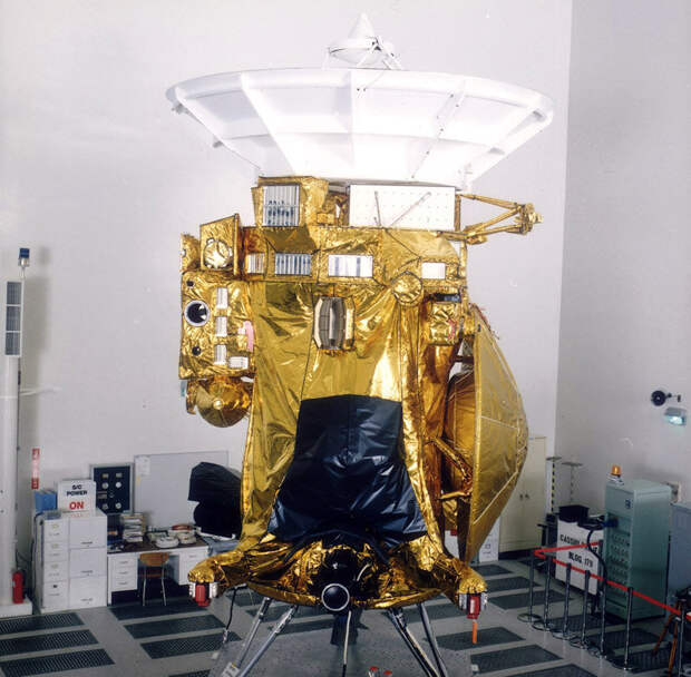 Кассини-Гюйгенс незадолго до старта и схема с его основными узлами, с 12 научными приборами и тремя элементами питания, плутониевыми РИТЭГами.