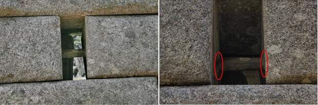 В свое время я показывал и фотографию палки, соединяющую два блока как арматура. И дефекты заливки (формовки). И заглаженный (как скребком) каменный выход рядом с кладкой в Саксайуамане в Перу.