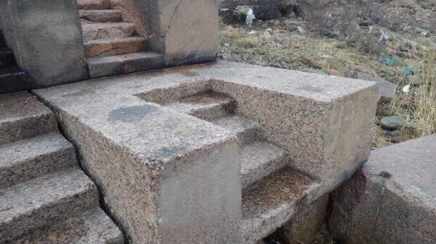 Эта лестница сделана из единого монолита. Вероятно, порода тоже выбрана по технологии бучардирования.