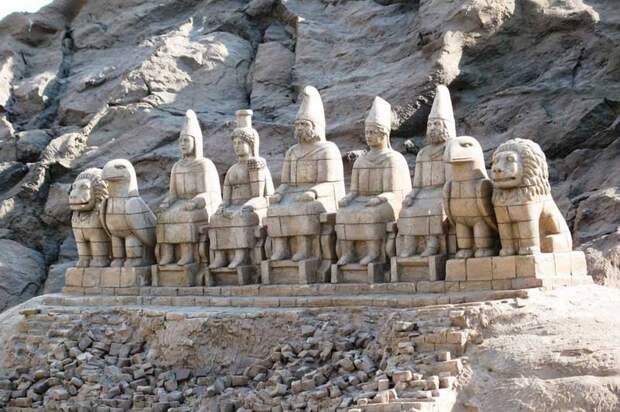 У подножья горы-кургана расположены статуи. Как египетские. Вероятно, их уже собирали из обломком реставраторы. Но так и не до собирали. Множество обломков так и продолжают лежать рядом