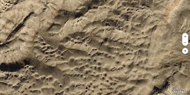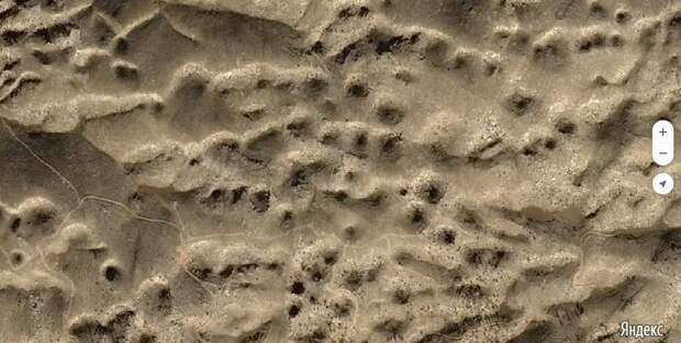 Точечная эрозия на поверхности и склонах гор. Как-будто эту территорию бомбили авиабомбами. Это похоже на какие-то провалы или ямы от выработок чего-то открытым способом.
