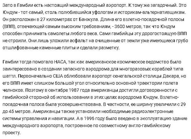В африканской стране Гамбия США в конце 20 в. построили аэропорт, который способен принимать самолеты любого тоннажа – Банжул Юндум. В проекте сочувствовало НАСА, т.к. этот аэропорт планировалось использовать как запасную точку приземления космических челноков (до закрытия этой программы). Вот вкратце информация про эту взлетно-посадочную полосу: