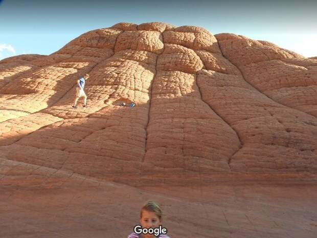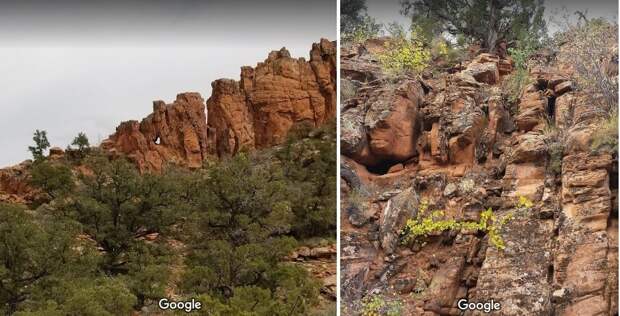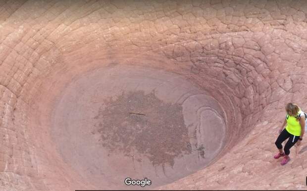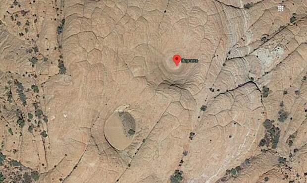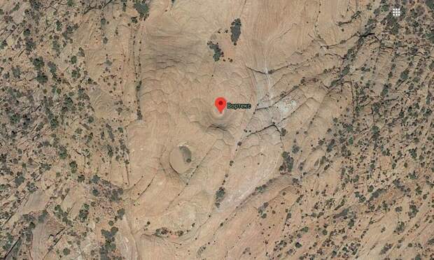 Пустынное место с заглаженными эрозией скальными выходами. В центре массива какое-то воронки. Вроде ничего необычного, пока не начнешь рассматривать детали, включая фотографии, сделанные в этом месте туристами.