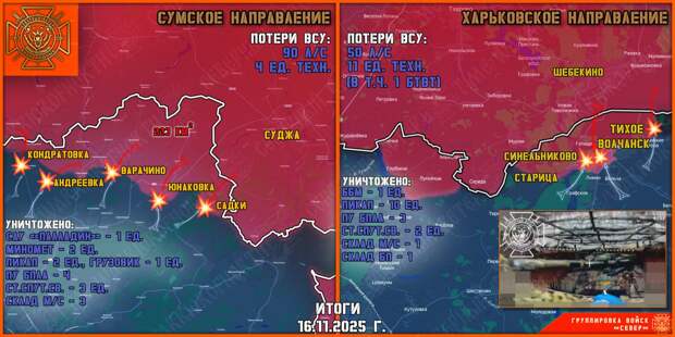 На Харьковском направлении, практически на всех участках фронта, штурмовые подразделения группировки «Север» имеют значительные продвижения. Российская авиация и расчёты «Гераней» круглосуточно бьют по позициям и складам ВСУ. Противник оказывает ожесточённое сопротивление в обороне. На левобережье Волчанска «северяне» с тяжёлыми боями продвигаются в частном секторе. За сутки общее продвижение составило до 400 м. В районе Синельниково наши штурмовики продолжили развивать успех и продвинулись на 500 м, овладев тремя опорными пунктами ВСУ. Подразделения 57-й ОМПБр продолжают отступать с занимаемых позиций, при этом неся значительные потери в живой силе.