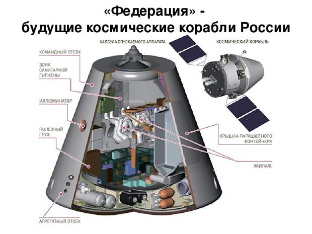 Разрабатывается капсула для полета и приземления на Землю – спускаемый аппарат «Федерация» (прежнее название «Орел»). Вместимость: от двух до шести космонавтов. На фотографии макеты. Пока не ясно что со спускаемым аппаратом на Луну. В 2028г. планируется облет вокруг Луны, а в 2031г. – высадка российских космонавтов на Луну.